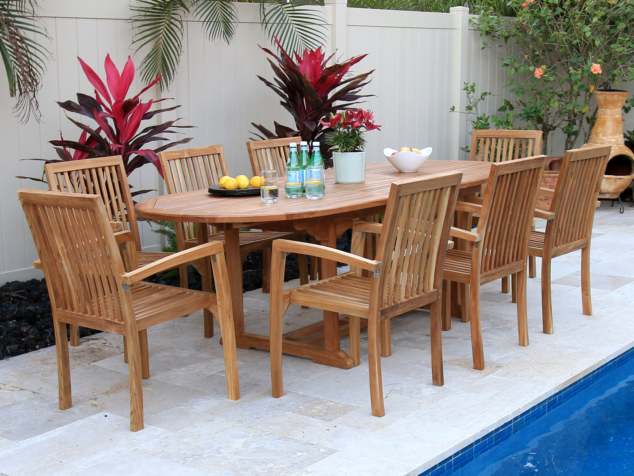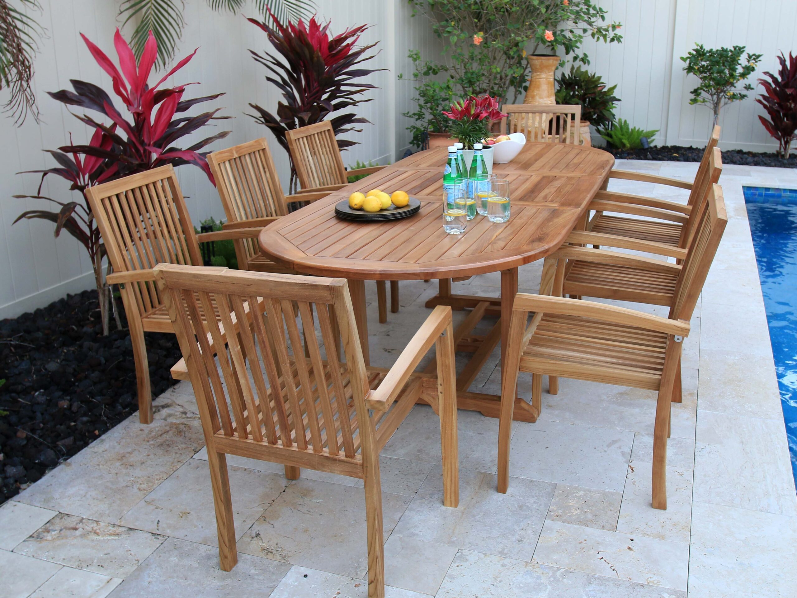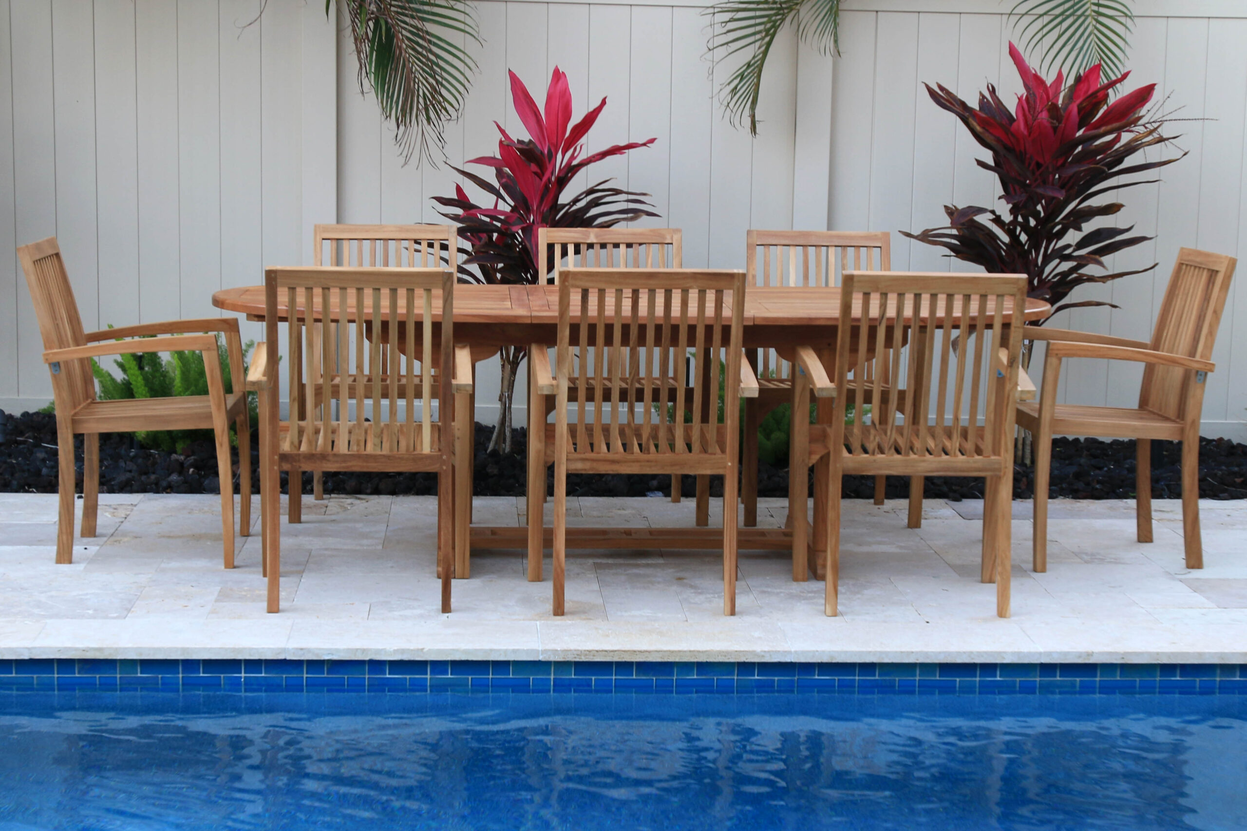 OVAL EXTENDING TABLE 94″ SINGLE LEAF – 8 KEONA STACKING CHAIRS – CUSHIONS