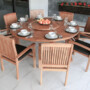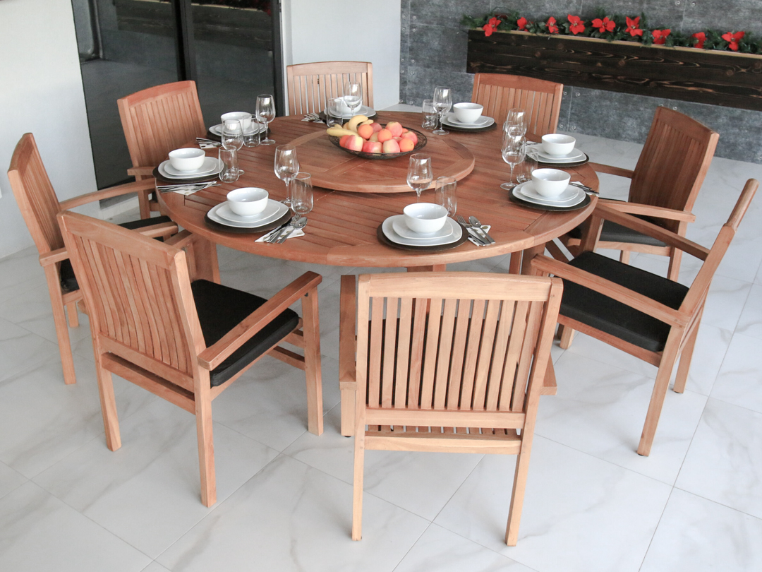 ROUND FIX TABLE 71″ – 8 MIAMI STACKING CHAIRS – CUSHIONS – LAZY SUSAN